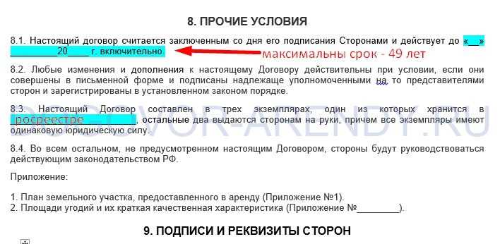 • Срок действия. Договор может быть составлен на краткосрочной или долгосрочной основе. Однако, максимальный срок аренды не может превысить 50 лет.