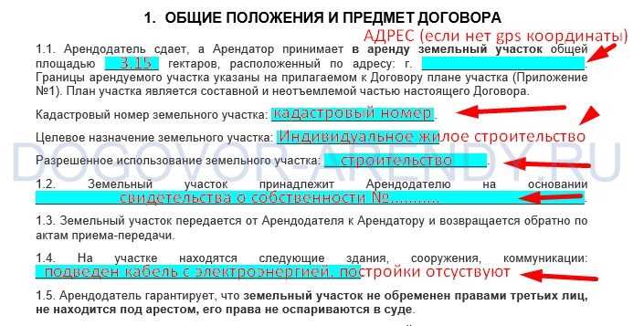 1. Предмет сделки. Это земельный надел, который предлагается в аренду. Его описание должно быть отмечено характеристиками: адрес НП, расположение, площадь, кадастровый номер.
