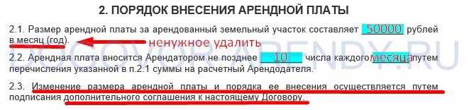 3. Арендная плата в договоре — самая важная часть. Тут необходимо указать когда арендатор должен вносить плату за земельный участок, а также обозначить способ оплаты. Немаловажным остается пункт, который запрещает арендодателю самовольно поднимать стоимость аренды — все оформляется посредством дополнительного соглашения.