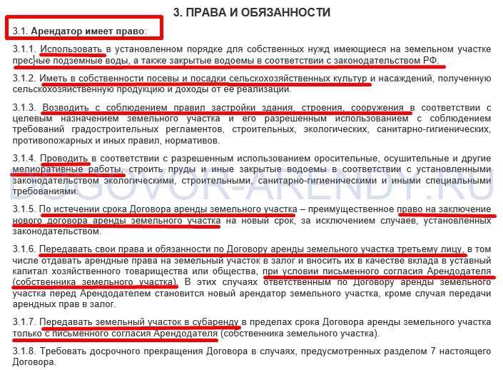 4. Права арендатора жестко предписывают в договоре аренды, что он может делать на земельном участке самовольно, и для чего его может потребоваться письменное согласие собственности. В частности к таким случаям можно отнести перенайм и субаренду земли.