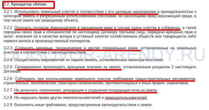 5. Обязанности арендатора похожи на его права, но тут можно выделить еще несколько основополагающих условий по использованию арендуемого земельного участка в рамках договора.