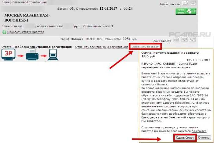 В личном кабинете пользователя спустя некоторое время появится соответствующая надпись о возврате билета. Она будет выглядеть следующим образом — Возврат по транзакции … обработан. Банк перечислил денежные средства.