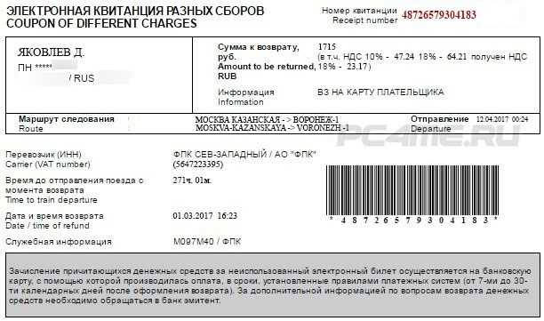 Для электронных билетов на поезда международного направления суммы зачисления средств на банковскую карту зависят от сроков возврата: