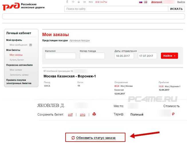 • Во вкладке «Мои заказы» отобразится перечень приобретенных электронных билетов, после сортировки по датам, не сложно будет найти необходимый. После того, как нужный билет был найден, необходимо нажать на надпись ниже «Обновить статус билета».