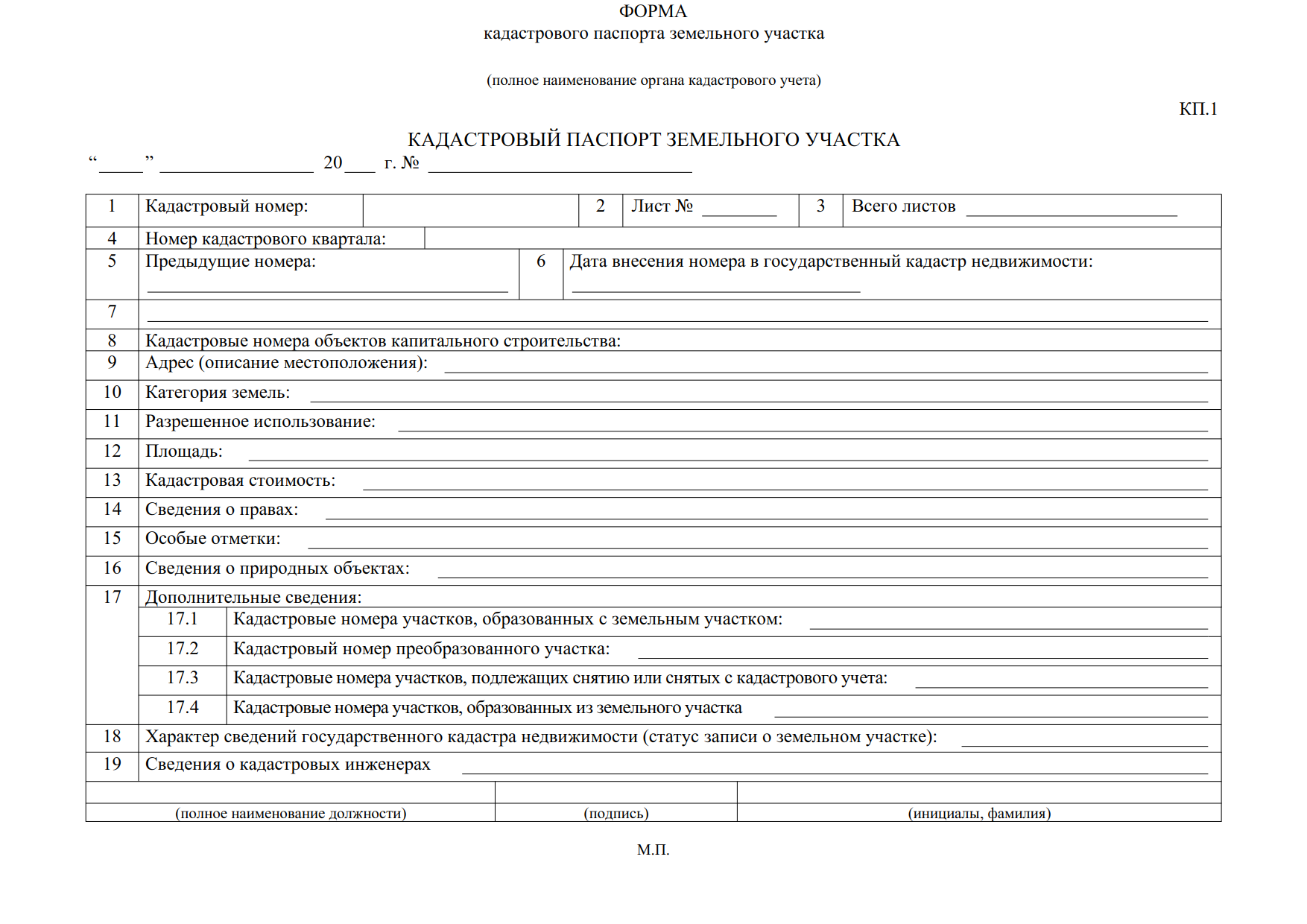 КП является техническо-правовым документом и подтверждает, что объект поставлен на учет в кадастре. КПЗУ изготавливают на нескольких листах в виде текстовой информации (описания и характеристики участка) и графических изображений (планы, схемы, чертежи). Каждый лист подписывается руководителем территориального подразделения кадастрового органа и скрепляется печатью учреждения.