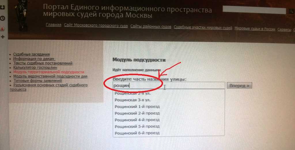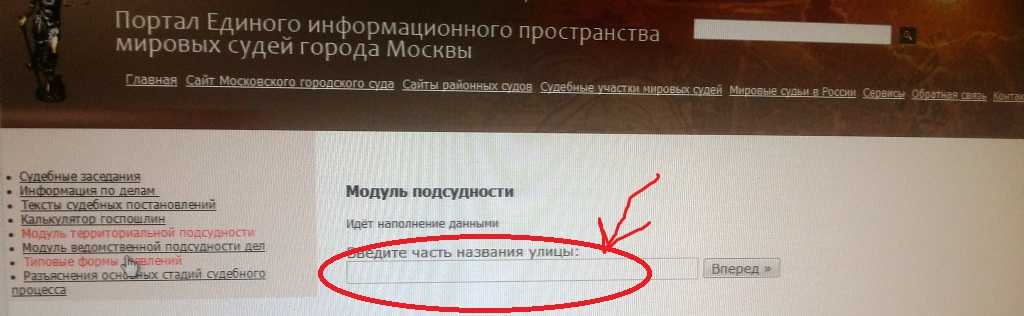 Переходим по http://mos-sud.ru/services/podsudn/ — данный сервис предназначен для определения судебного участка по адресу.