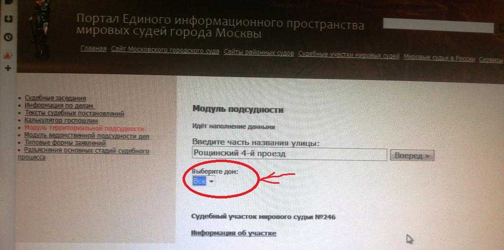 В появившемся поле ставите галочку напротив «Я ищу участок мирового судьи», выбираете регион, пишете название города и улицы. Если одна улица относится к нескольким мировым судьям, появится список домов отдельно по каждому участку. Щелкните на название судебного участка, и вы увидите адрес официального сайта мирового судьи и его контакты.