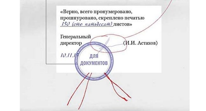 Как вы уже поняли, подшивать документы нитками — только полдела, так как нужно же еще их правильно заверить. Для того чтобы выполнить указанную процедуру, необходимо подготовить стикер (можно набрать в программе MS Word и распечатать) размером 5 х 6 см. На нем указывается информация о количестве страниц в деле (не только цифрами, но и прописью), об особенностях вложенных документов (к примеру, некоторые из них могут быть повреждены), а также отмечается фамилия, должность и подпись специалиста, который занимался прошивкой. Этим фрагментом бумаги фиксируется узел нитей на последней странице, после чего ставится печать предприятия: одна часть оттиска должна находиться на наклейке с надписью, а вторая на листе.