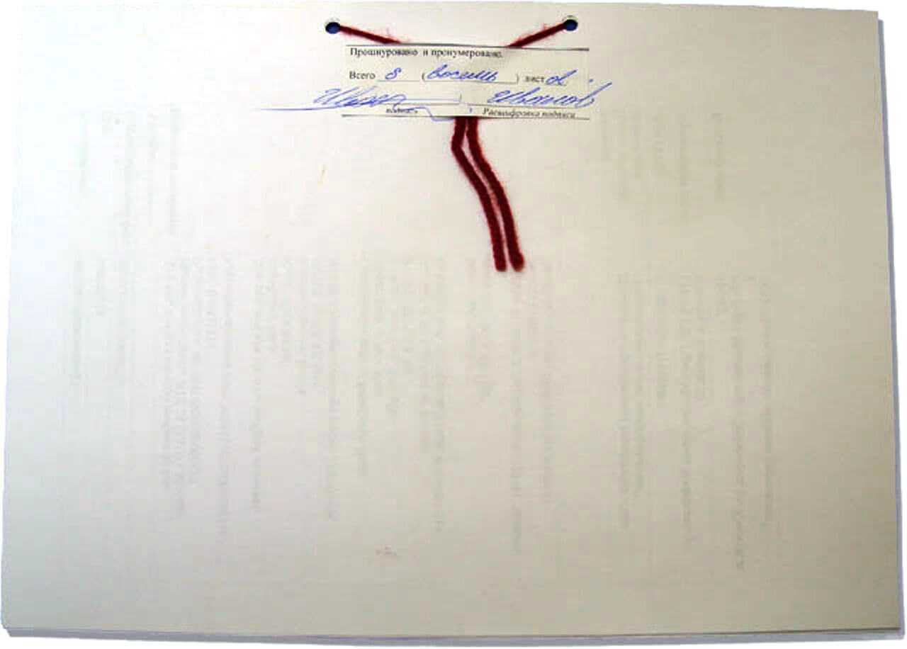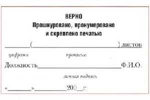 Важно! В случае если листа прошивки нет, следует из белой бумаги вырезать небольшой кусок размером 3 на 5 см, приклеить его и подписать «прошито и пронумеровано».