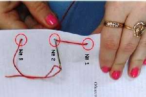 - Просунуть иголку с изнаночной стороны через дырочку номер два;