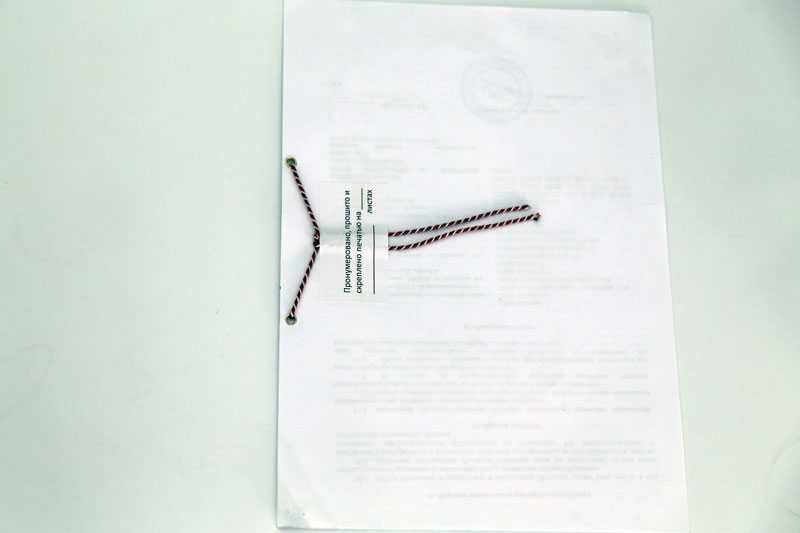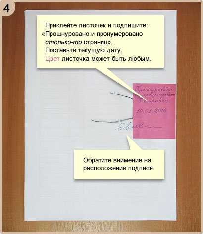 Рекомендации даются не только относительно того, как сшивать документы, но и как оформить бумажную наклейку на оборотной стороне. Она должна закрывать место прошивки и сам узел. Размеры наклейки не превышают сорока — пятидесяти миллиметров. На ней размещается заверительная подпись с указанием числа пронумерованных страниц. Подписывается это все руководителем организации или иным представителем, имеющим такие полномочия. Далее ставится печать предприятия — таким образом, чтобы она захватывала и наклейку, и подпись с Ф.И.О. человека, заверившего документы.
