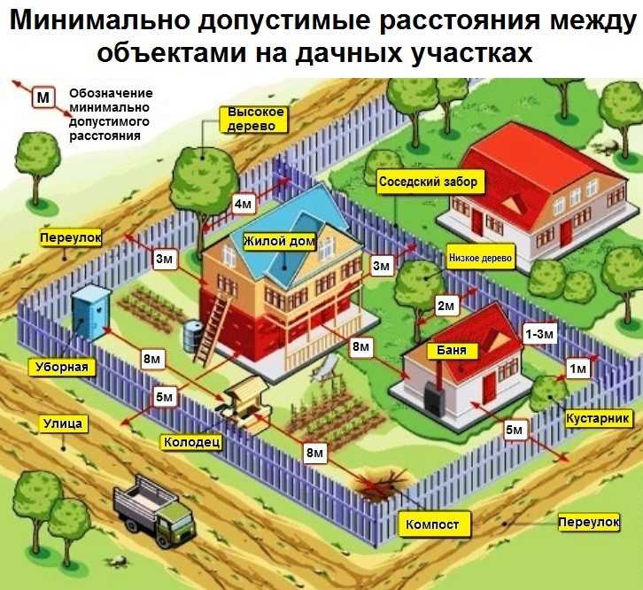 Схема: Минимально допустимые расстояния между объектами на дачных участках.