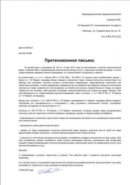 Претензионное письмо должно содержать следующую информацию: