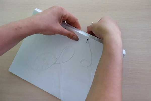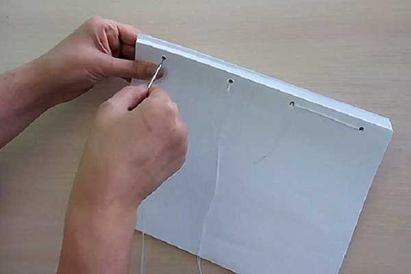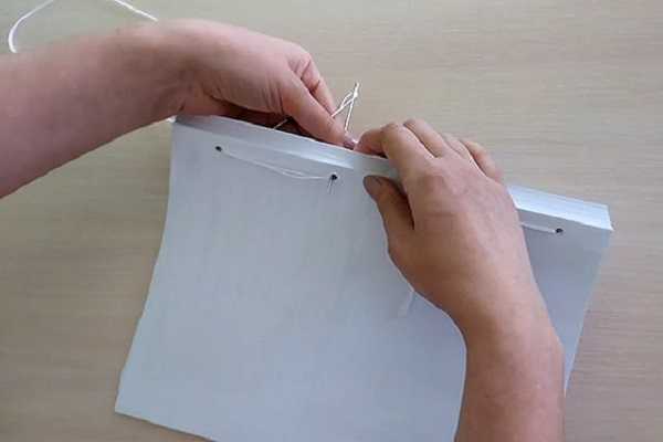 - Направить иглу во второй отсек от правого края листа, потянуть шнурок вниз, что производится на лицевой стороне.