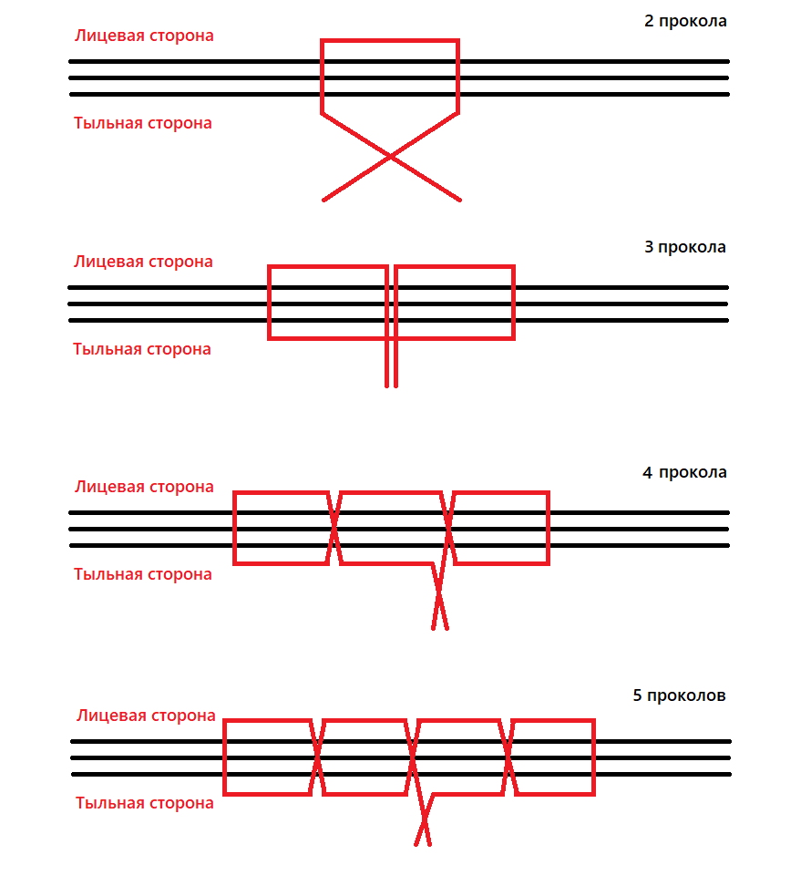- При втором проколе иголку с ниткой выводим на тыльную сторону, причем отверстие делаем на 3 см выше первого.
