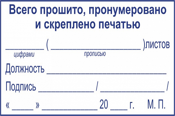 После завершения процедуры следует сделать заверительную надпись. Ее нужно оформить на отдельном листе и расположить на последнем листе уже готовых бумаг. Записка должна содержать количество всех пронумерованных страниц, которые были прошиты, а также описывать примечания о состоянии документов, возможных помарок или порванных листов. Надпись подписывает и заверяет глава организации, указывающий на ней свою должность и расшифровку поставленной подписи.
