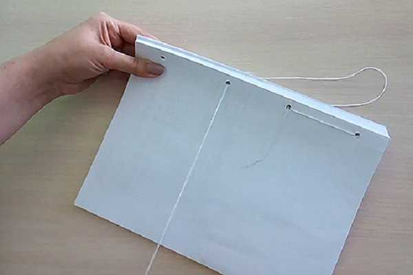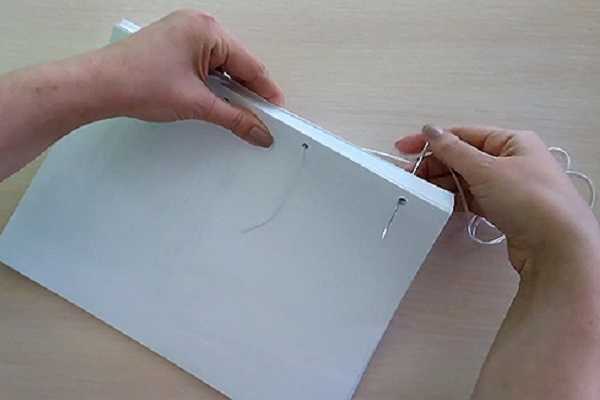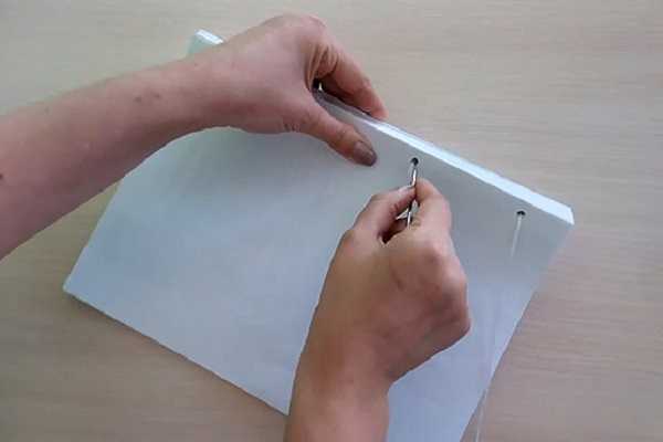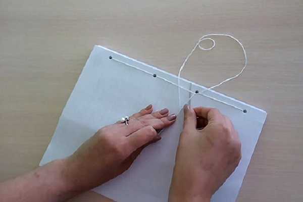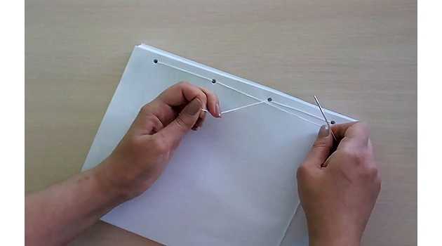 - На третьем шаге нужно продеть в отверстие, находящееся от левой части страницы с иной стороны «тетради». Потянуть нитку вверх.