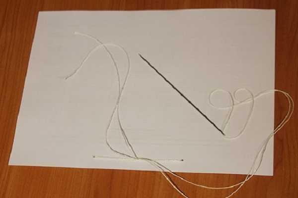 - Сделать легкое движение иголкой с лицевой части документации на небольшом расстоянии от центрального прокола справа — проткнуть бумагу, вытянуть нить с тыльной стороны.