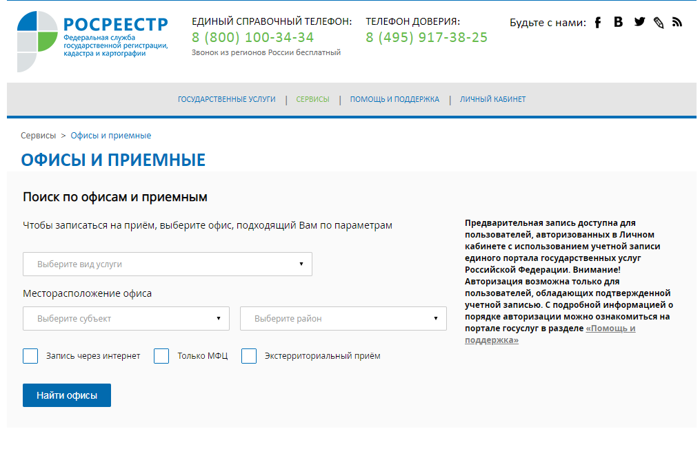 Для граждан, которые проживают в удаленных населенных пунктах, есть возможность записаться на прием в ближайший офис Росреестра через интернет [urlspan]на официальной странице[/urlspan]: