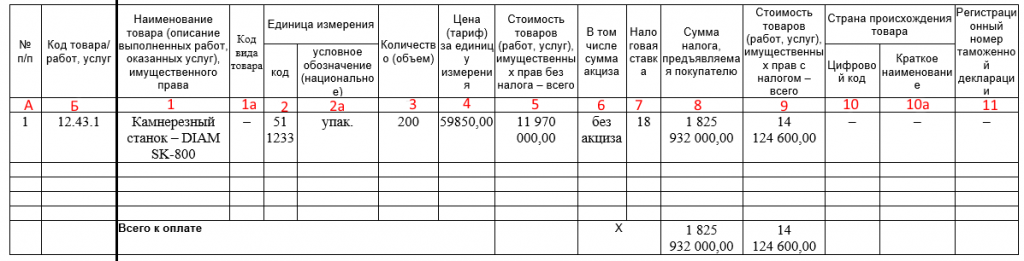 Заполнение табличной части производится в соответствии с порядком заполнения счетов-фактур с учетом следующих особенностей:
