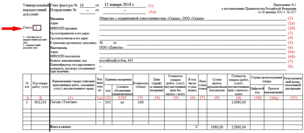 В универсальном передаточном документе со статусом 1 строки (1)-(7), а также графы 1-11 необходимо заполнять так же, как в обычном счете-фактуре, то есть в соответствии с постановлением № 1137. При этом для строки (2) «Продавец» и строки (6) «Покупатель» предусмотрены особенности.