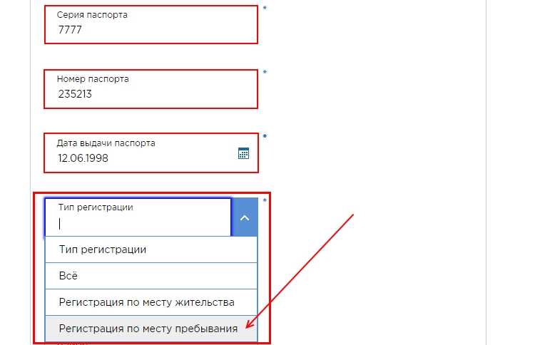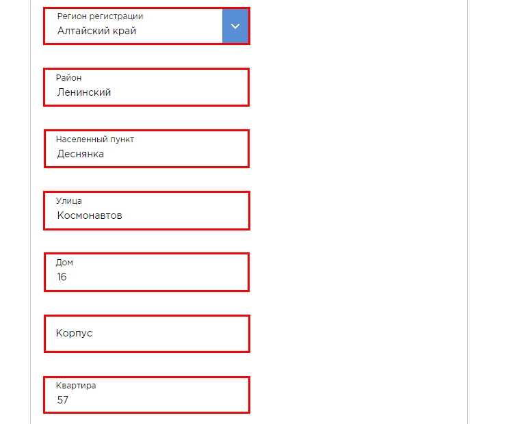 • Тип регистрации, регион регистрации – район, населенный пункт, улицу, дома, корпус, квартиру.