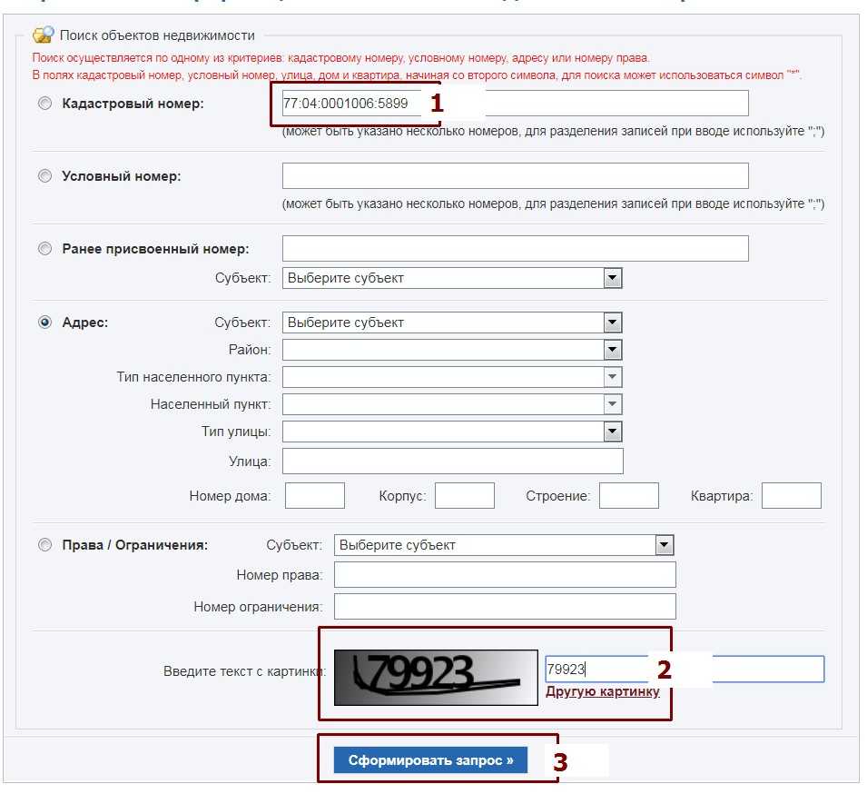 - Вводим кадастровый номер, капчу (проверочный цифровой код) и жмём кнопку «Сформировать запрос». Также поиск можно осуществлять не только по кадастровому номеру, а также по условному номеру, адресу или номеру права.