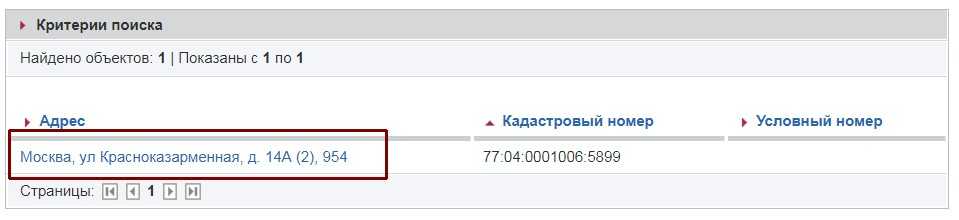- После поиска появятся результаты поиска: «Найдено объектов: 1». Если поиск производится по адресу – могут появиться несколько результатов, в случае, если по одному адресу находится несколько объектов недвижимости. Кликаем на адрес, который подкрашен синим цветом.