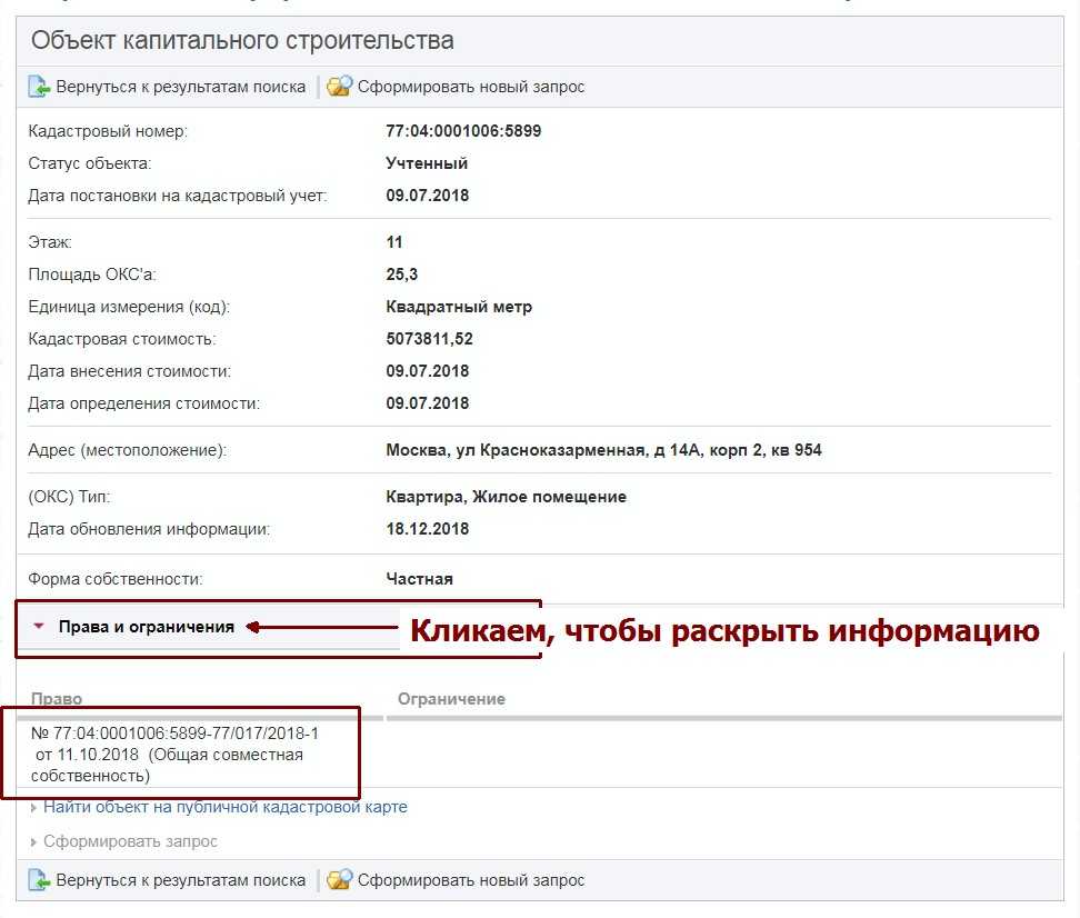 - Нам открывается карточка объекта недвижимости. Обязательно кликаем по вкладке «Права и ограничения». И мы узнаем, что имеется номер регистрации права собственности № 77:04:0001006:5899-77/017/2018-1 от 11.10.2018 г. В скобках указано «Общая совместная собственность». Это говорит о том, что квартирой владеют муж и жена.