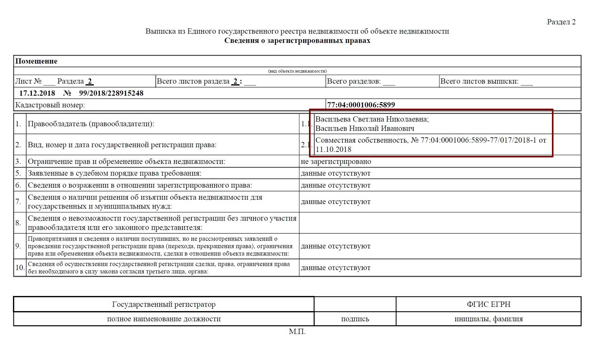 Для того, чтобы проверить собственника квартиры, а именно – зарегистрированное право собственности, Вам нужно ознакомиться с разделом 2 в Выписке из ЕГРН на квартиру. Данный раздел содержит информацию о дате регистрации, ФИО собственника и учетный номер государственной регистрации права.