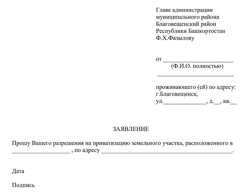 - заявление, в котором гражданин излагает просьбу оформить ему конкретную землю в собственность (бланк можно взять в учреждении);