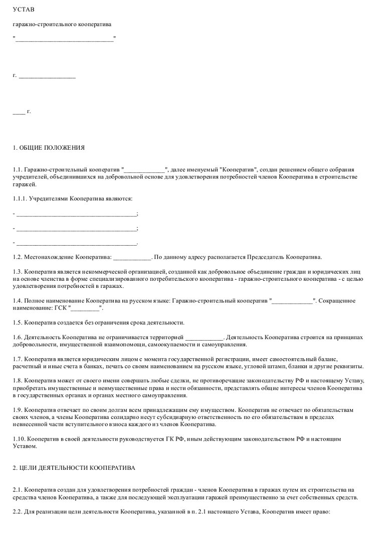- Общими усилиями разработайте устав ГСК. В нем должны заключаться цели создания и предмет деятельности организации, указываться подробные данные кооператива (название, адрес и т.п.) и все финансовые сведения.