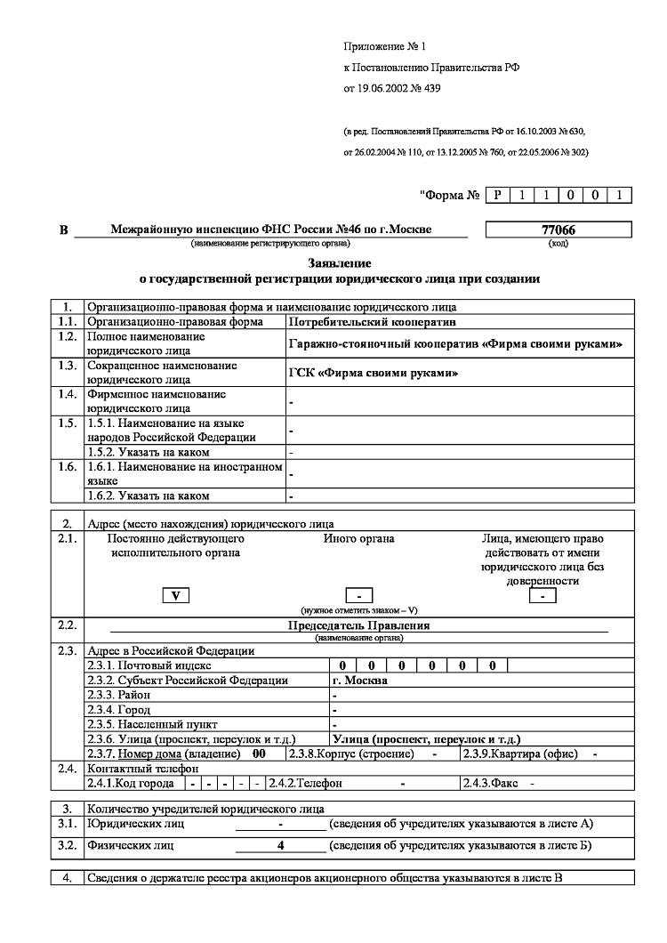 Заполненный образец заявления на регистрацию ГСК – форма P11001;