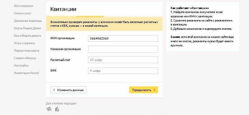 - Для поиска нужной организации можно ввести название или ИНН. Если нужной компании еще не производились переводы с этого сайта, пользователю нужно будет самостоятельно ввести все реквизиты из квитанции (название, ИНН, расчетный счет, БИК).