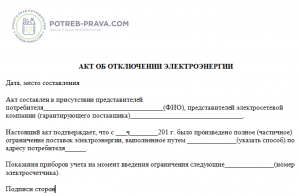 Ограничение и приостановление подачи электроэнергии оформляется актом об отключении. Данный документ составляется исключительно в простой письменной форме. Любой другой вид акта делает его недействительным.