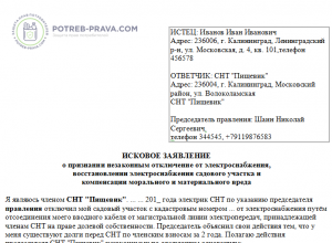 Чтобы подать иск, необходимо соблюсти претензионный порядок. Направить в СНТ требование восстановить подачу электроэнергии. Претензию доставить способом, подтверждающим ее получение.