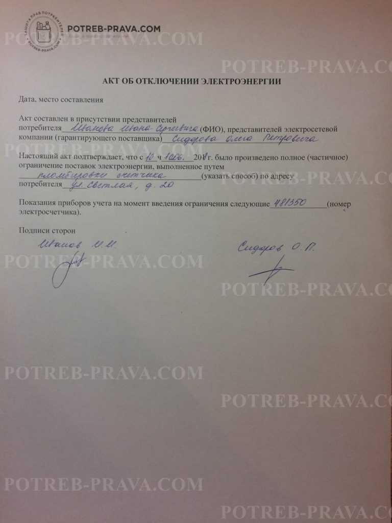 ВНИМАНИЕ! Посмотрите заполненный образец акта об отключении электроэнергии: