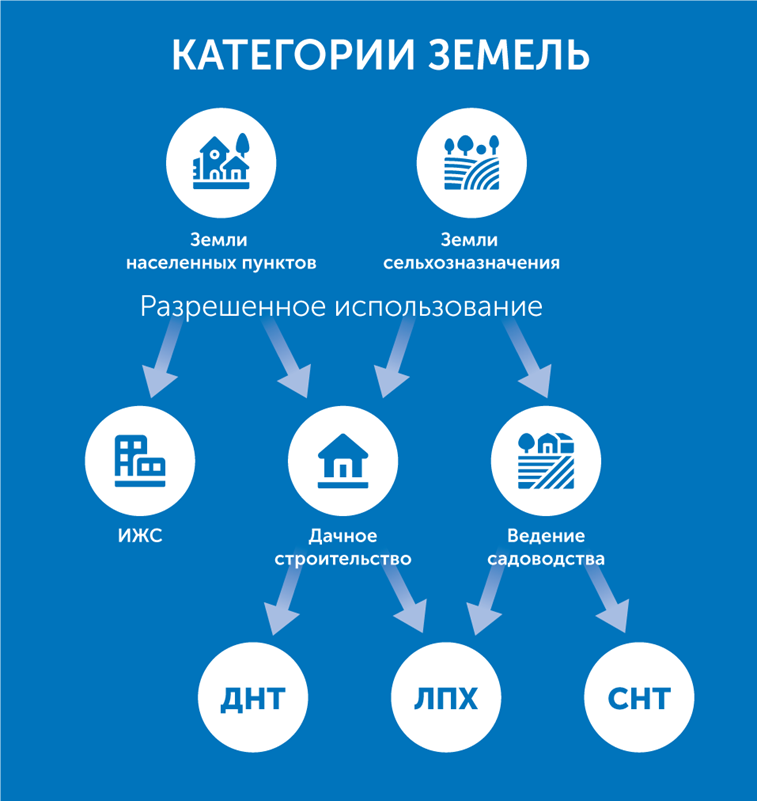 Каждая из нижеперечисленных категорий имеет вид разрешенного использования земли – ИЖС, ДНП или СНТ. Участки СНТ могут находиться только на землях сельскохозяйственного назначения, ИЖС на землях поселений, а ДНП на тех и других.