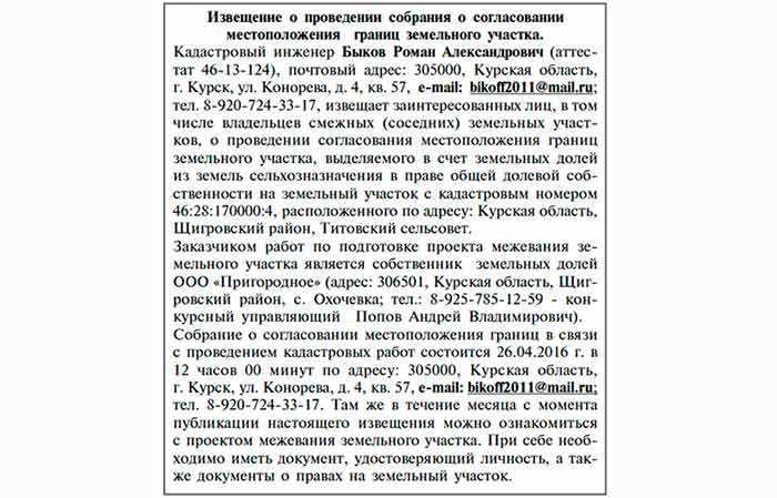 - неизвестного хозяина земли извещают через размещение объявления о межевании в СМИ. Если по истечении месяца ответ не поступил, то согласование произведено по умолчанию.