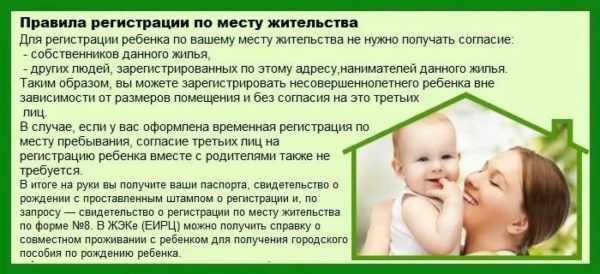 - Регистрация ребёнка по месту жительства. Для этого надо решить с мужем, где будет прописан ребенок, по месту жительства матери или отца (в случае, если прописка разная), тем самым предоставив в соответствующий ЖЭК следующие документы: заявление от прописанного по фактическому месту жительства родителя с просьбой о регистрации ребенка, заявление от второго родителя о том, что он не возражает против регистрации ребенка (в ЖЭК надо будет пройти обоим родителям), заявление от имени ребенка с просьбой о регистрации. К заявлениям надо прикрепить: свидетельство о рождении ребенка и его две ксерокопии; паспорта обоих родителей с ксерокопиями; свидетельство о браке и его ксерокопию. После этого приготовится, что паспорта и свидетельство о рождении ребенка заберут на несколько дней, после чего вы получите справку о прописке ребенка и его проживании вместе с родителем (нужно для получения пособия на ребёнка, и, возможно, для получения полиса ОМС), соответственно лучше брать не менее трёх экземпляров. Все это совершенно бесплатно!
