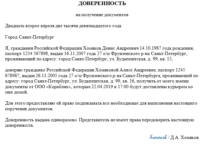 При этом не имеет значения, кто является доверителем, это может быть даже целая компания. В этом случае конкретный человек будет представлять интересы всей организации, а именно, получать документацию. Не исключена необходимость в подписании сопроводительных документов. Если поверенный наделяется такими полномочиями, это должно быть зафиксировано в доверенности.