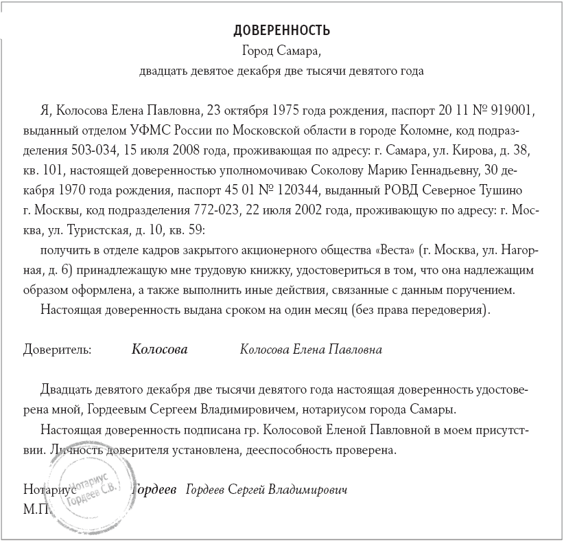 Еще можно попросить нотариуса изготовить доверенность. У него уже есть шаблоны на все случаи жизни — нотариус добавит ваши личные сведения и распечатает на красивом бланке. За эту работу нотариус возьмет плату «за услуги правового и технического характера». Стоимость может в несколько раз превышать сумму госпошлины, но зато не придется ни о чем беспокоиться. Нотариус сам разберется, чего вы хотите и как это оформить.
