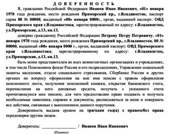 Доверенности в простой письменной форме можно самостоятельно напечатать на компьютере или написать от руки. Например, чтобы получить справку, документ или обратиться за назначением пенсии в Пенсионный фонд РФ, не нужно идти к нотариусу. Можно поручить эти действия другому лицу, указав в доверенности сведения о доверителе и представителе, дату доверенности, полномочия и срок действия. Еще в простой письменной форме можно оформить доверенность на управление автомобилем, получение трудовой книжки на работе.