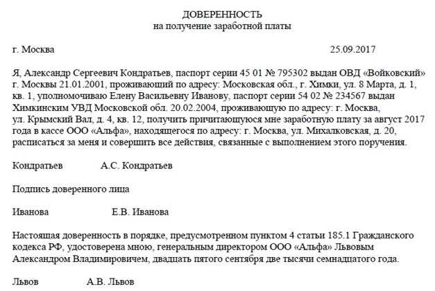 Как написать доверенность – образец для получения зарплаты за другого человека.