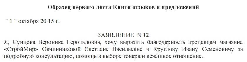 Здесь приводится пример заполнения книги посетителем. На лицевой стороне листа пишется собственно отзыв/предложение, с обязательным указанием его даты.