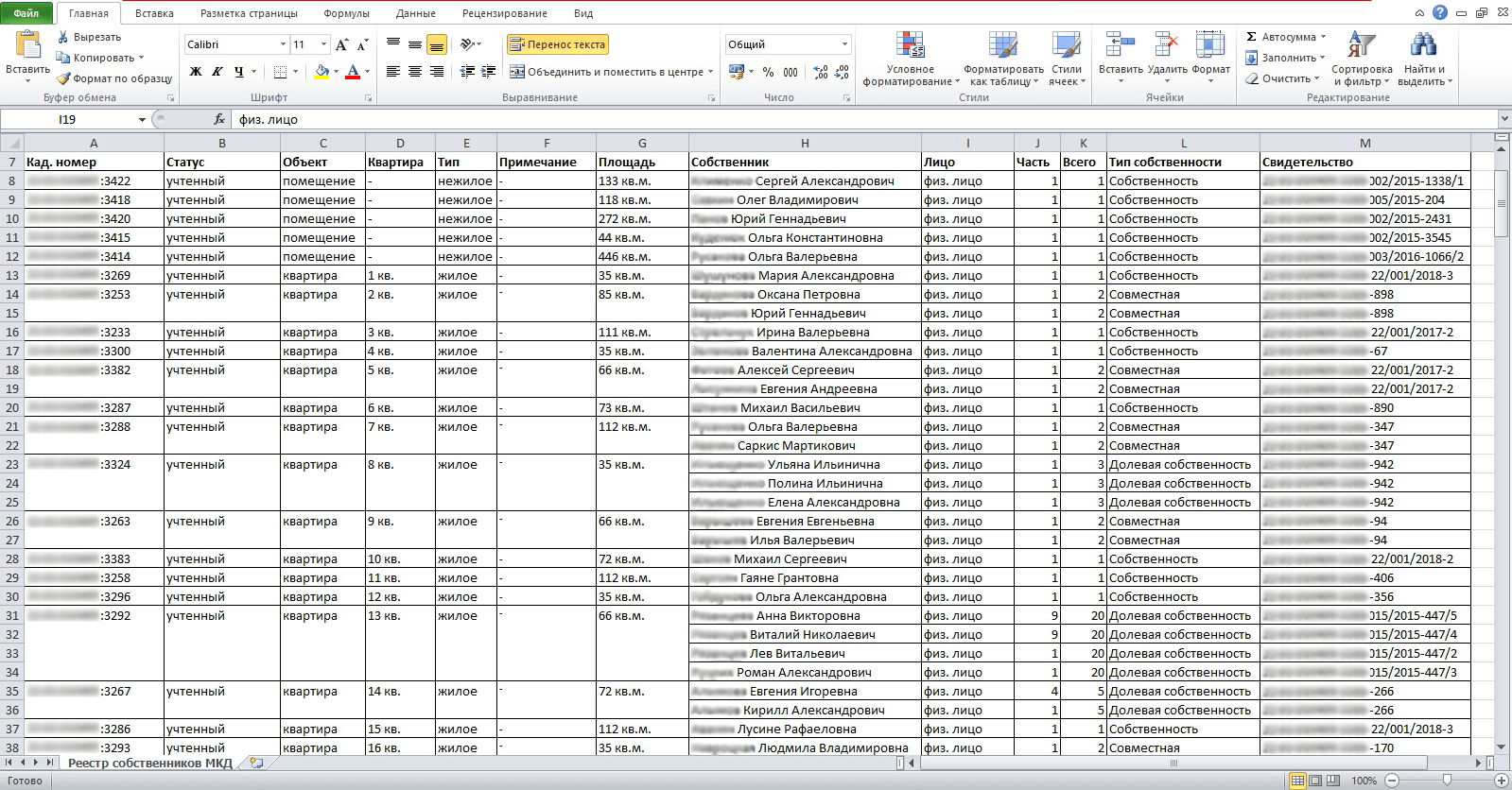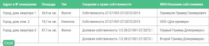 Реестр предоставляется в электронном виде, в формате программы EXCEL. Дополнительно к такой таблице мы предоставим архивы с выписками ЕГРН на каждое помещение в доме в двух форматах (XML+ЭЦП Росреестра и HTML). Первый формат — оригиналы файлов Росреестра для подтверждения достоверности, второй формат — перекодированный аналог, который можно открыть и просмотреть в любом браузере.