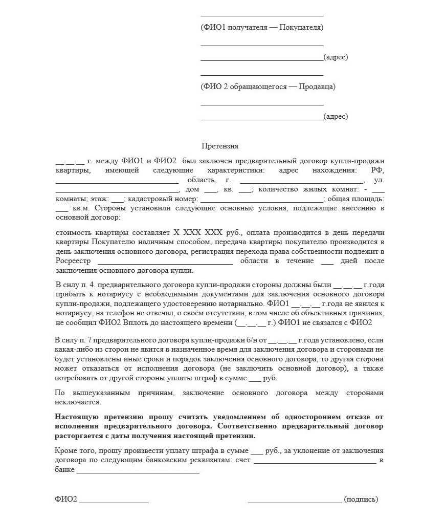 Как составить письменное уведомление о расторжении предварительного договора в одностороннем порядке