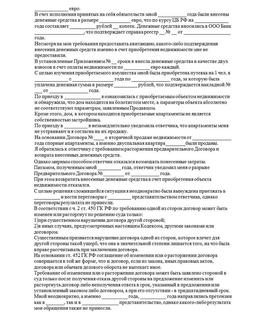 При невозможности мирно урегулировать ситуацию Покупатель (если деньги должны быть возвращены ему) может инициировать судопроизводство, составив исковое заявление «О взыскании задатка в двойном размере» или «Об истребовании суммы аванса». Чтобы не вести несколько параллельных судебных процессов, эти иски можно объединить с главным иском – «О расторжении предварительного договора и взыскании денежных средств».