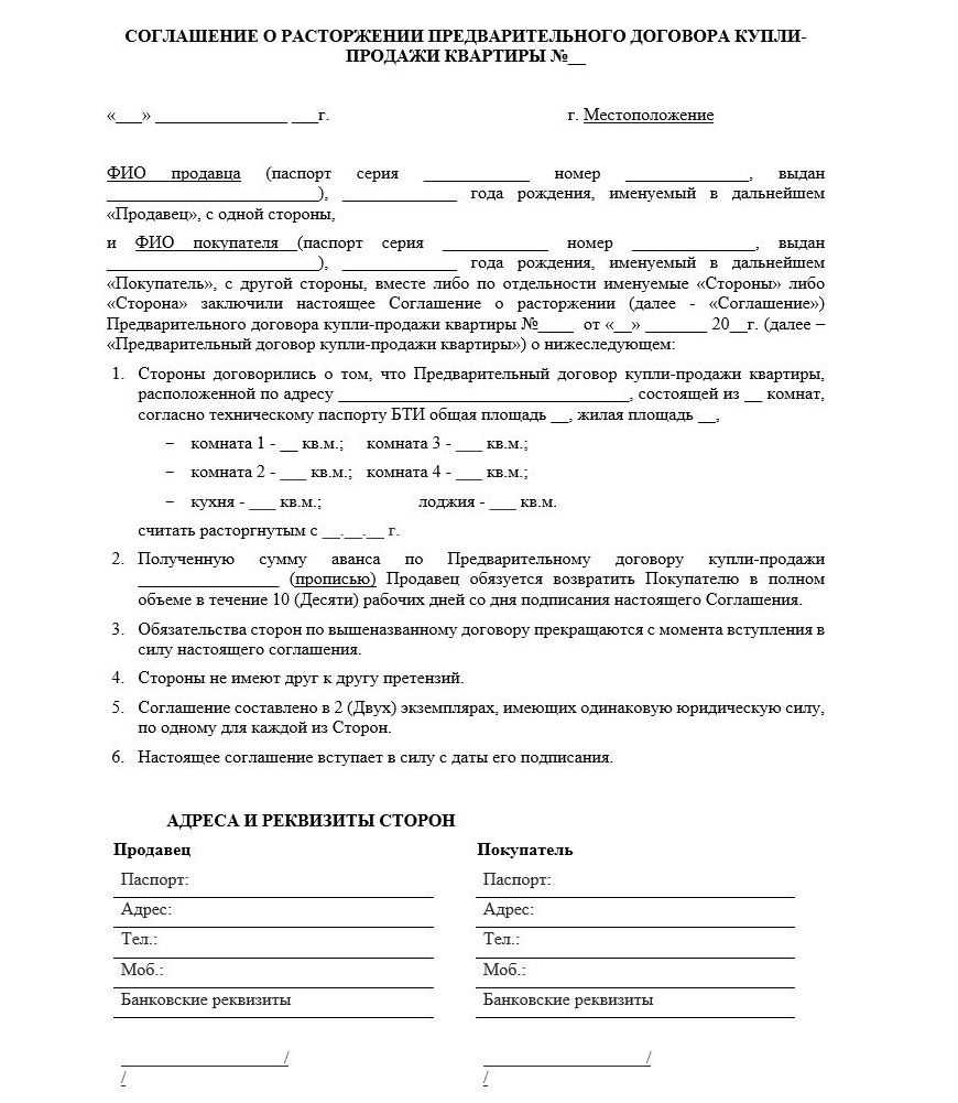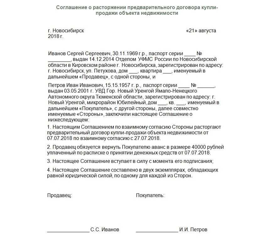 Как составить соглашение о расторжении предварительного договора купли-продажи квартиры