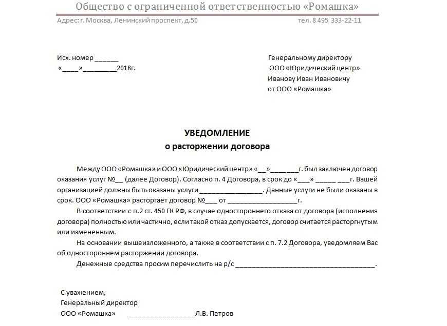 Образец письменного уведомления о расторжении предварительного договора в одностороннем порядке